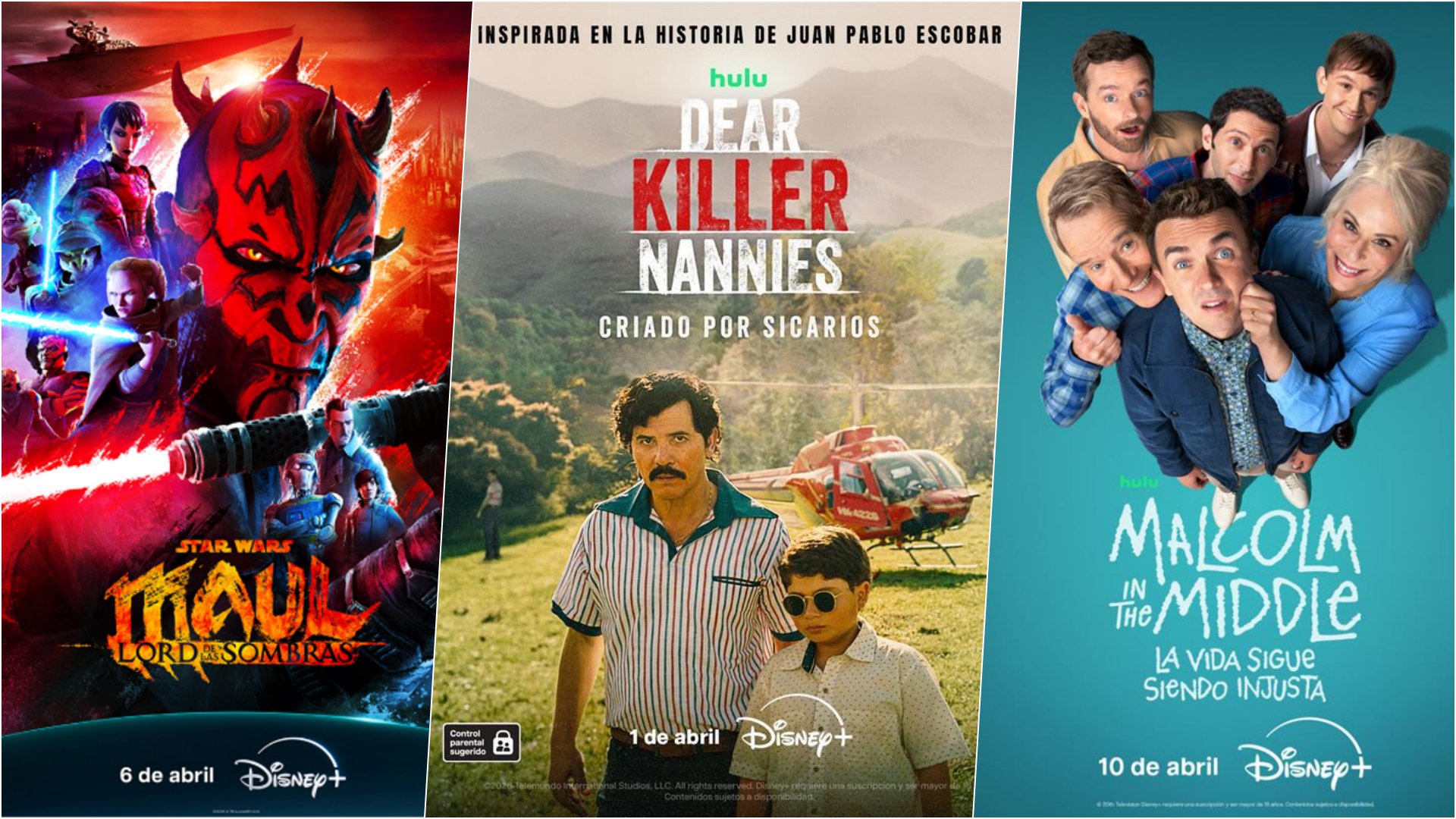El calendario abre el 1 de abril con Dear Killer Nannies: Criado por sicarios, una serie que explora la compleja infancia del hijo de Pablo Escobar, mientras que los fans de la acción galáctica tienen una cita el 6 de abril con el estreno de Star Wars: Maul - Señor de las Sombras. Sin embargo, el fenómeno nostálgico del mes será, sin duda, la llegada de Malcolm: De mal en peor el 10 de abril, la esperada continuación que reúne al elenco original veinte años después. A estos títulos se suman nuevos episodios de Daredevil: Born Again y el estreno de Los Testamentos, asegurando un mes cargado de maratones imperdibles.